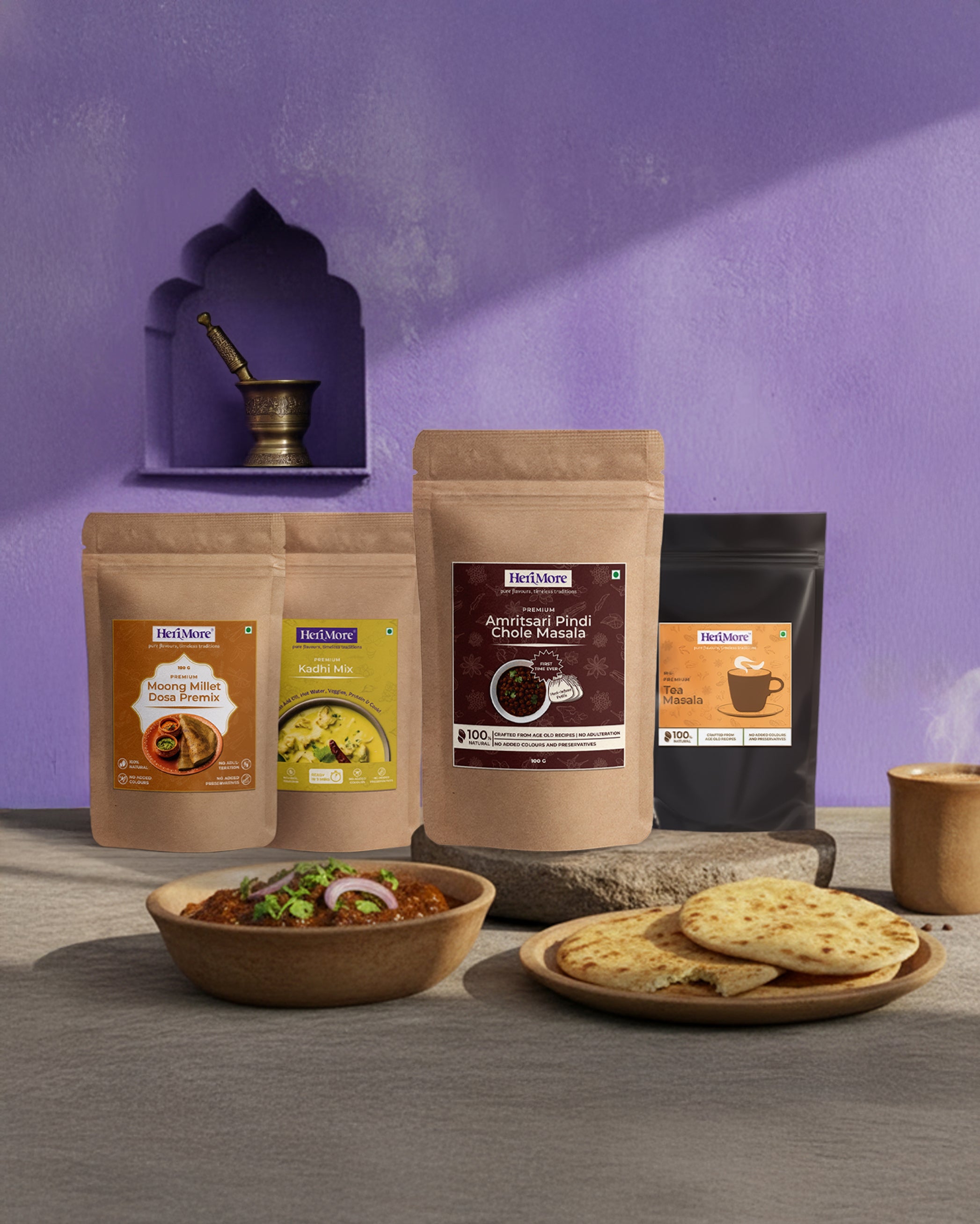 HeriMore isn’t just a spice company. We offer masalas, instant chutney mixes, millet breakfast premixes, gluten-free flours, and more — all made with family recipes, small-batch care, and zero adulteration. Every category carries the same promise: No Milavat. Only Purity.