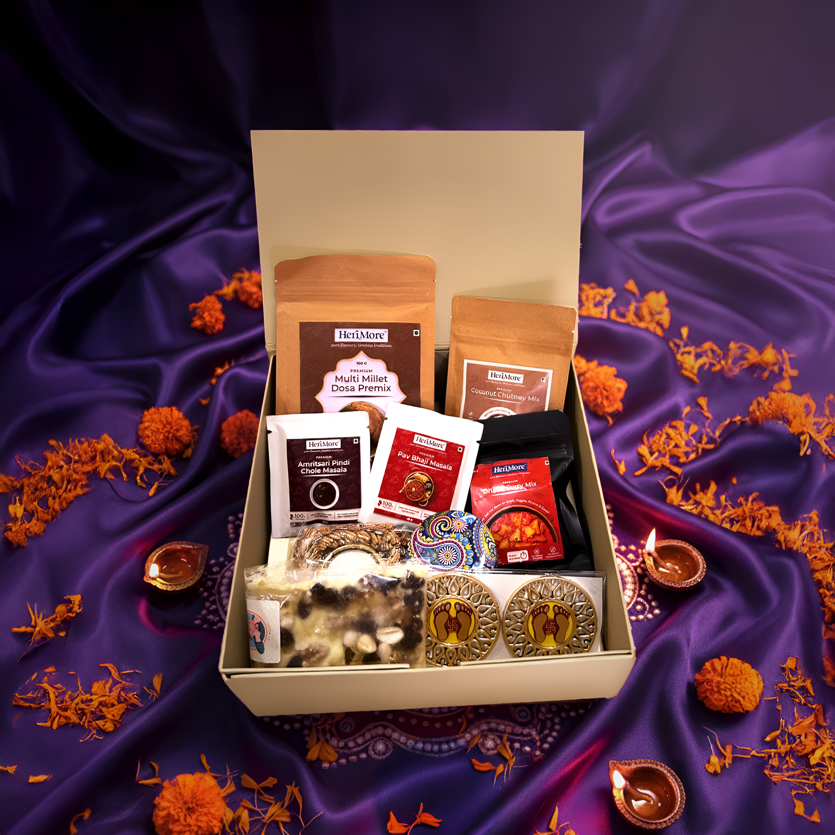 હા. અમે તહેવારો, લગ્નો અને કોર્પોરેટ ઉજવણીઓ માટે પ્રીમિયમ ગિફ્ટિંગ કલેક્શન તૈયાર કરીએ છીએ. બ્રાન્ડ્સ અને સંસ્થાઓ ભારતીય વારસાની ઉજવણી કરતા અને સ્વસ્થ જીવનને પ્રોત્સાહન આપતા કસ્ટમાઇઝ્ડ બોક્સ બનાવવા માટે HeriMore સાથે સહયોગ કરી શકે છે. અમારો પ્યોરિટી ગિફ્ટિંગ પ્રોગ્રામ કંપનીઓને તેમની વેલનેસ પહેલના ભાગ રૂપે કર્મચારીઓ, ભાગીદારો અથવા ગ્રાહકો માટે "નો મિલાવટ, ઓન્લી પ્યોરિટી" ભેટોનો સમાવેશ કરવાની પણ મંજૂરી આપે છે.