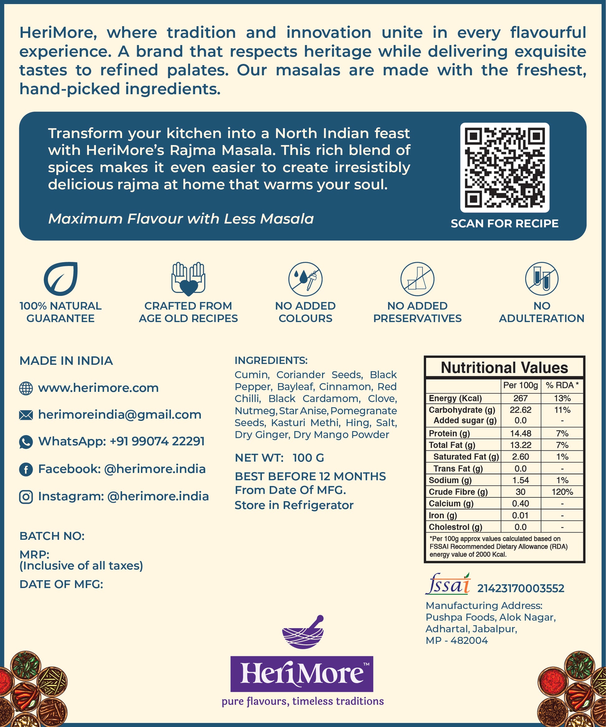 Create an authentic North Indian dining experience with HeriMore’s Premium Rajma Masala. This expertly handcrafted masala transforms ordinary kidney beans into a soul-warming dish that is both hearty and flavourful.
