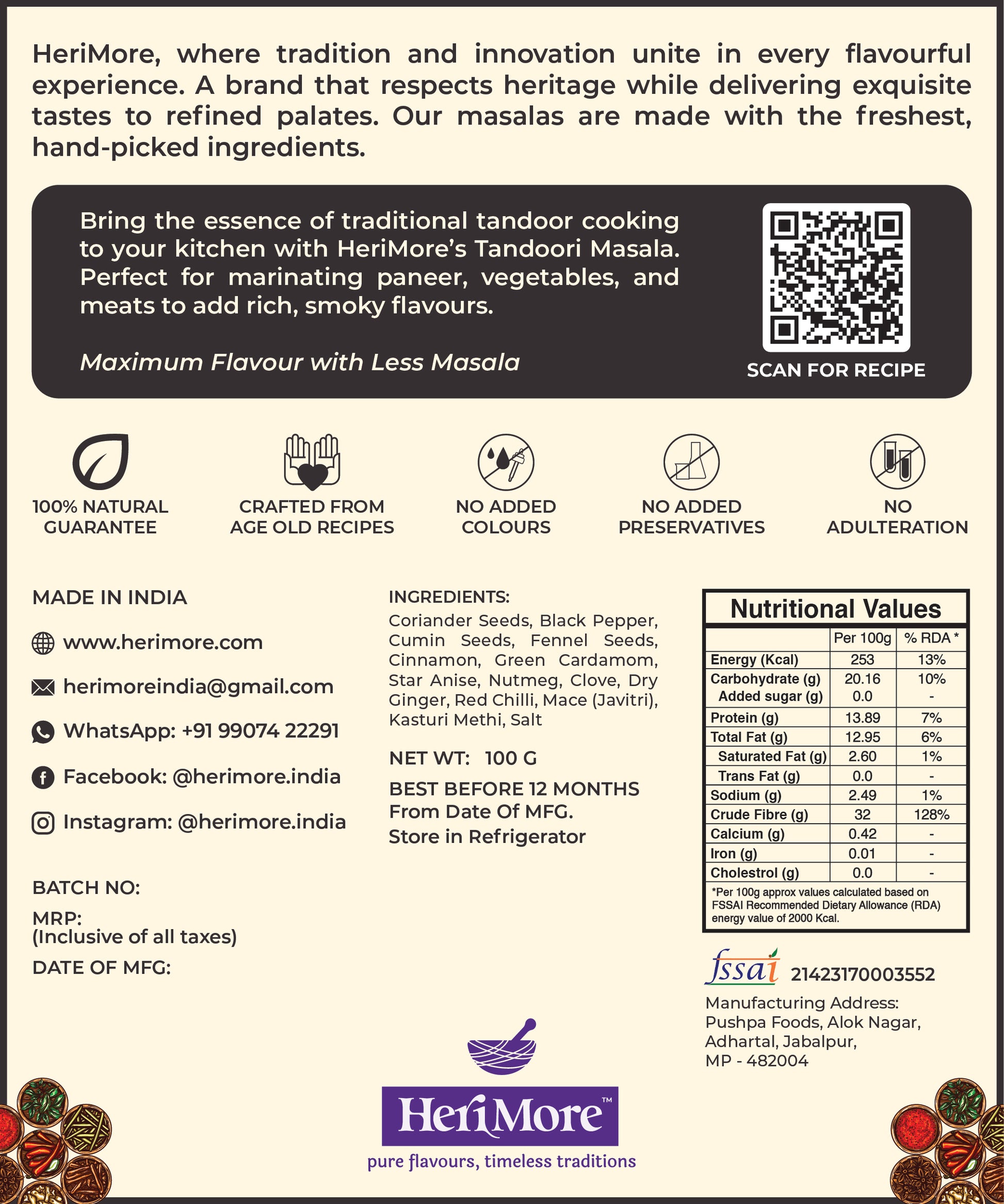 - Authentic Tandoor Flavour: Bring the essence of traditional North Indian tandoor cooking to your kitchen with HeriMore’s Premium Tandoori Masala. Perfectly crafted to deliver the rich, smoky flavours that make your favourite dishes come alive.