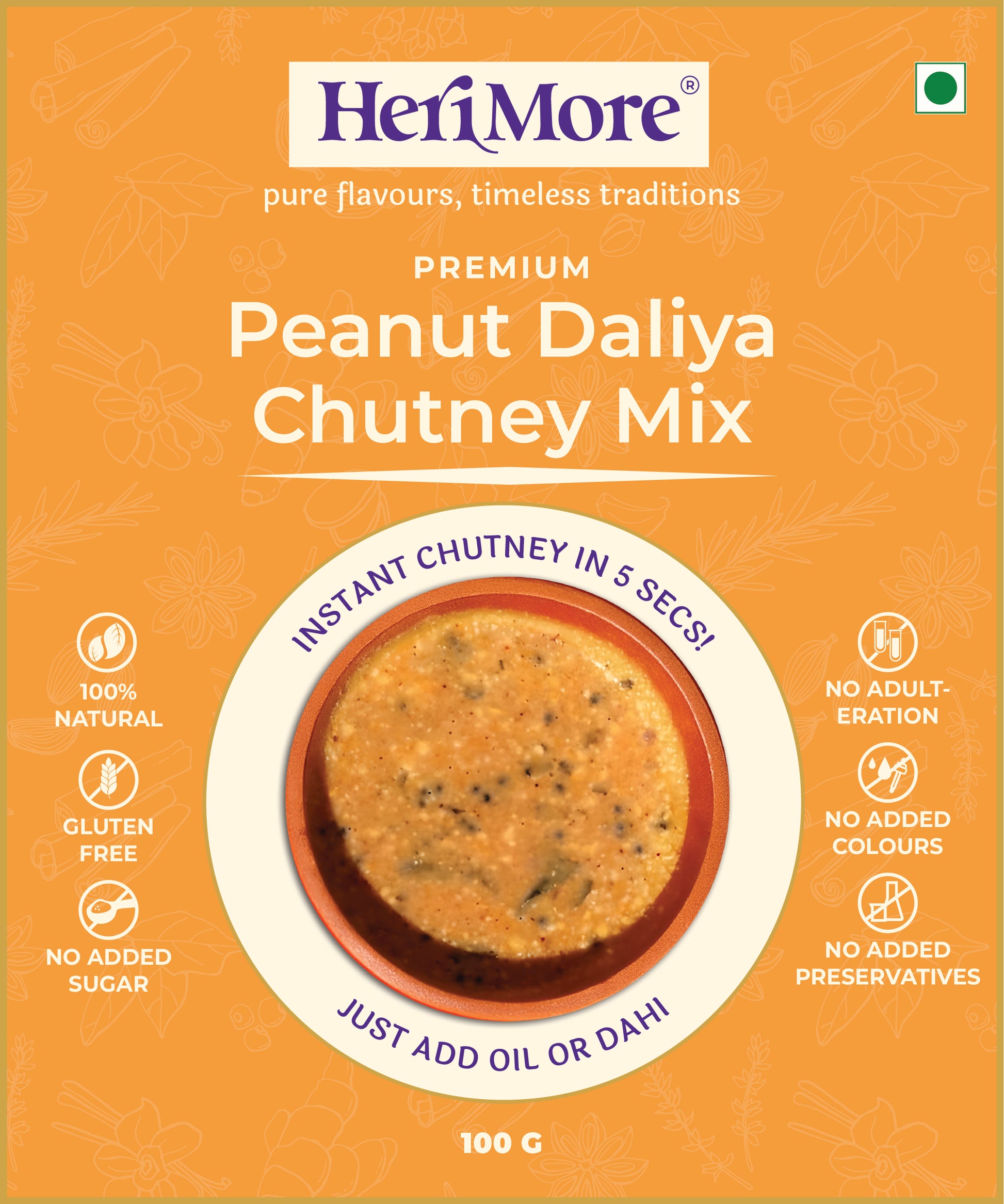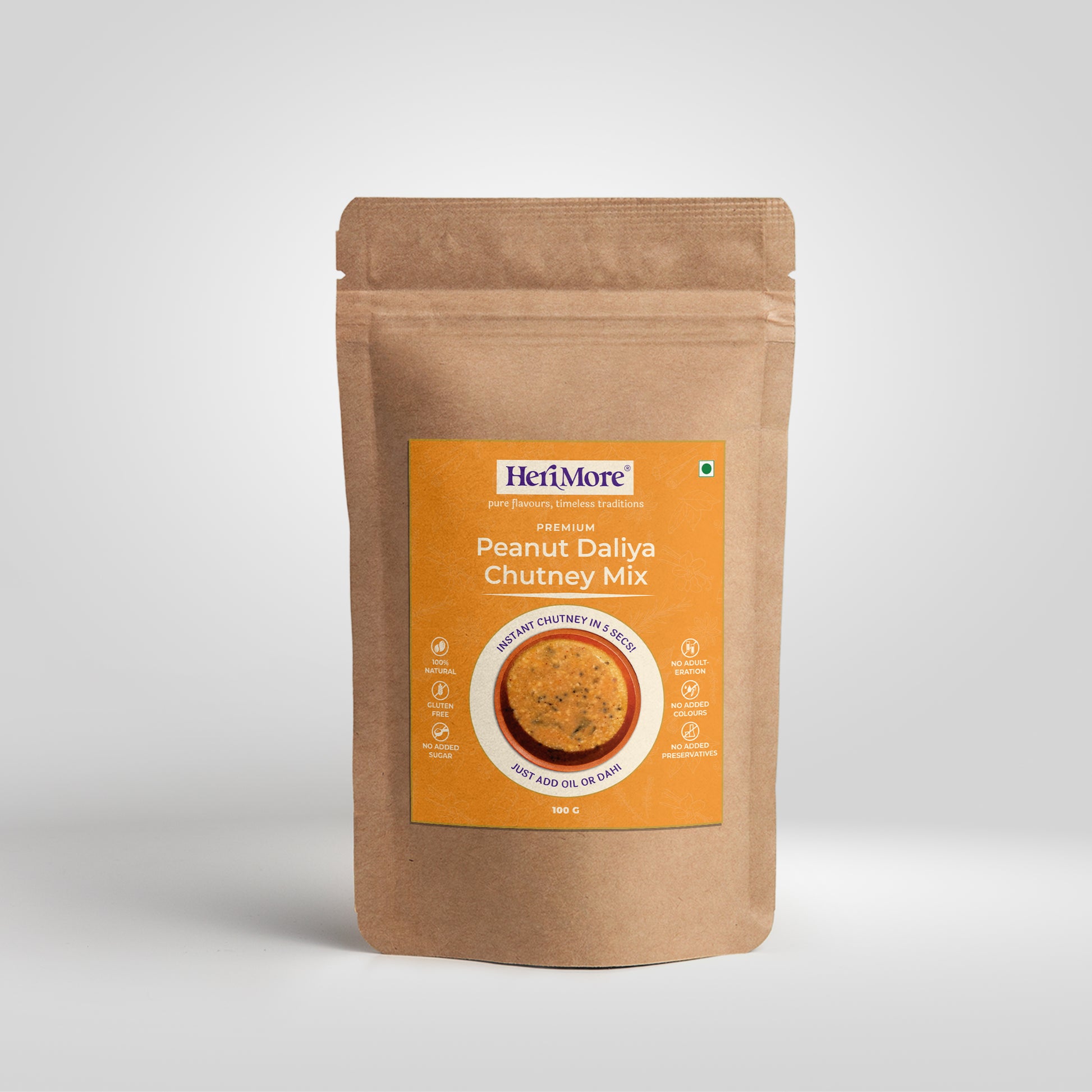 Indulge in a bold, crunchy, and perfectly spiced chutney that combines roasted peanuts, crispy roasted gram (daliya), tangy tamarind, and fiery red chillies to create a deeply textured, flavour-packed delight. HeriMore’s Premium Peanut Daliya Chutney Mix is crafted for those who love a homemade-style chutney with a restaurant-quality taste—ready in just 5 seconds!